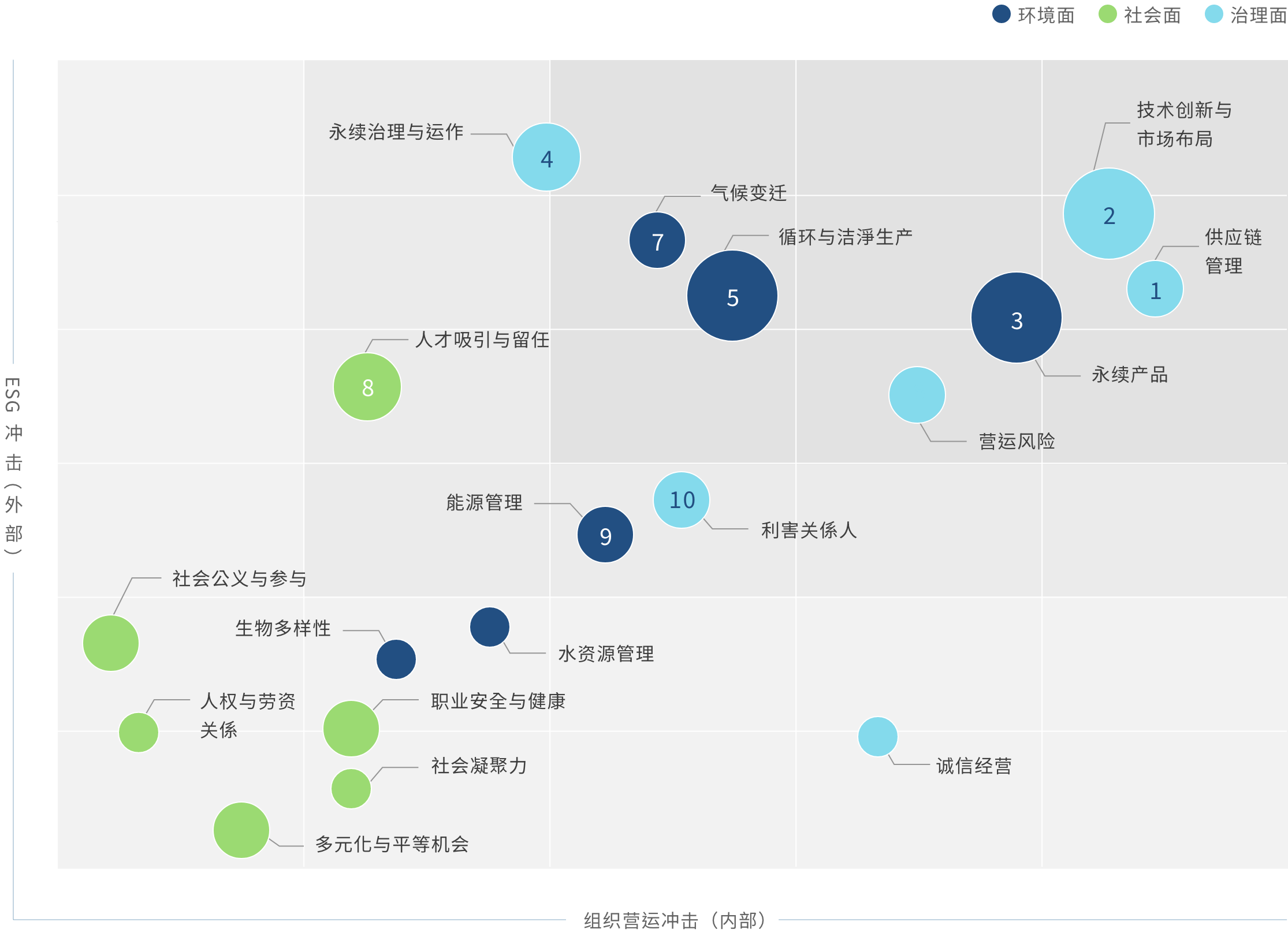 | 营收成长 | 客户满意 | 营运风险 | 员工向心力 | 产业技术发展(正向) | 创造上游产值(正向) | 投资人财务资本(正向) | 产品环境效益(正向) | 提升再生能源(正向) | 提高员工生活福祉(正向) | 耗用能资源(负向) | 採购造成环境冲击(负向) | 极端气候(负向) | |||