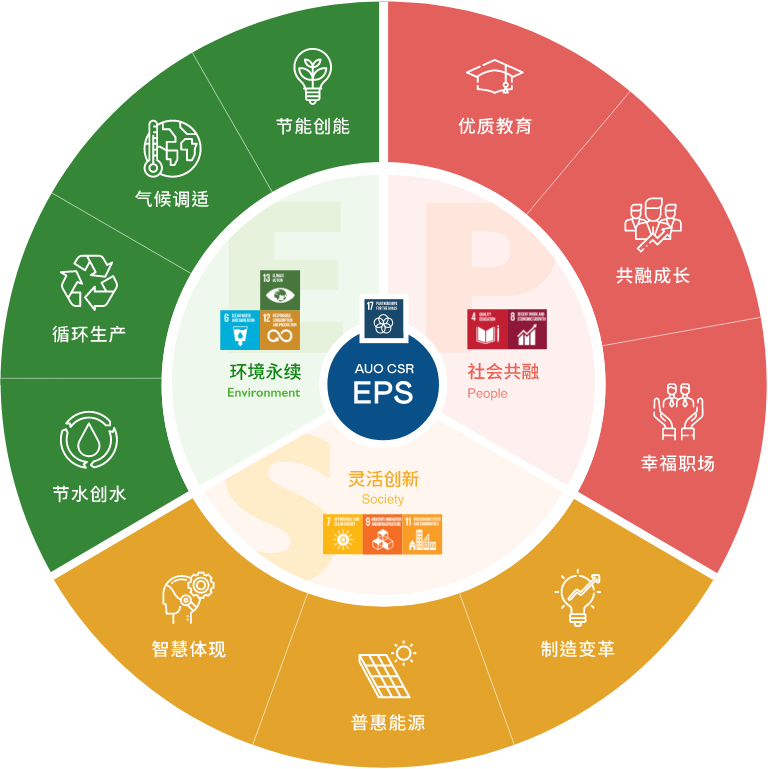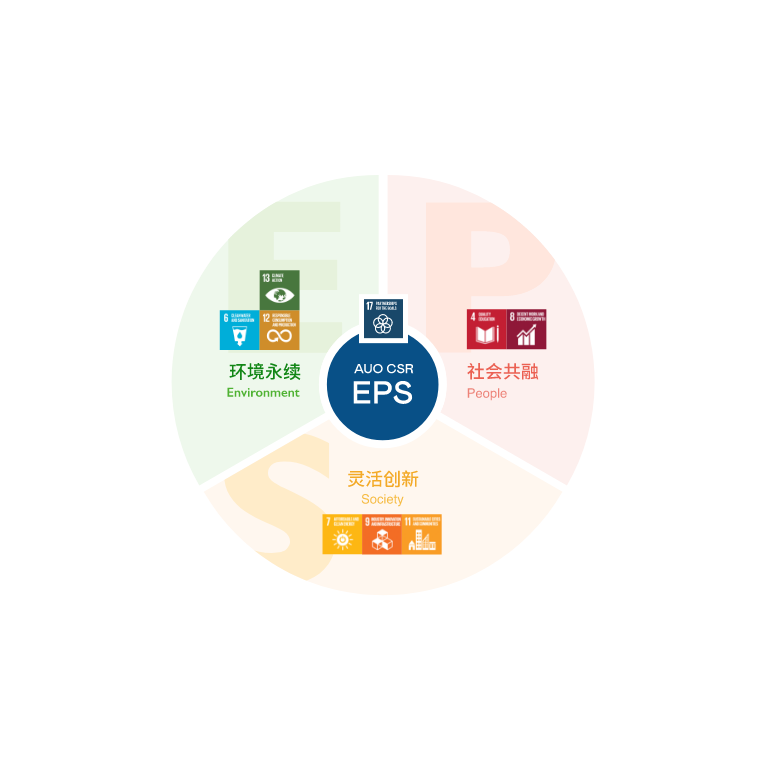 根据联合国所发展的17项永续发展目标,8868体育光电以「超越企业社会责任,创造共享价值」为企业永续愿景发展蓝图,订出环境永续、共融成长与灵活创新的EPS(Environment, People & Society)三大永续发展主轴;以响应日益受关切的环境议题与社会共融趋势。