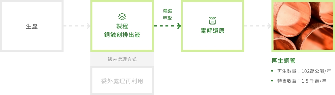 • 將蝕刻下來含銅之廢液,透過電解方式,製作高純度之銅管,轉為其他工業領域應用