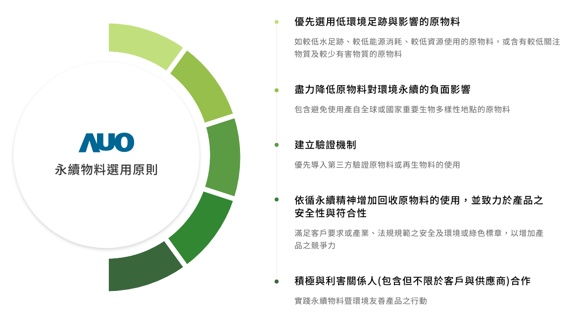 友達致力於永續產品的精進,以卓越技術發展促進產品創新與升級,並承擔生產者延伸責任,積極回應利害關係人對於永續產品之期待。我們評估產品生命週期各階段對環境與人類的影響,從原物料階段即以選用低環境負荷與風險之原物料為優先考量項目,並與價值鏈夥伴合作發展永續物料,使友達提供之產品與服務對人類健康安全及環境影響友善無虞。